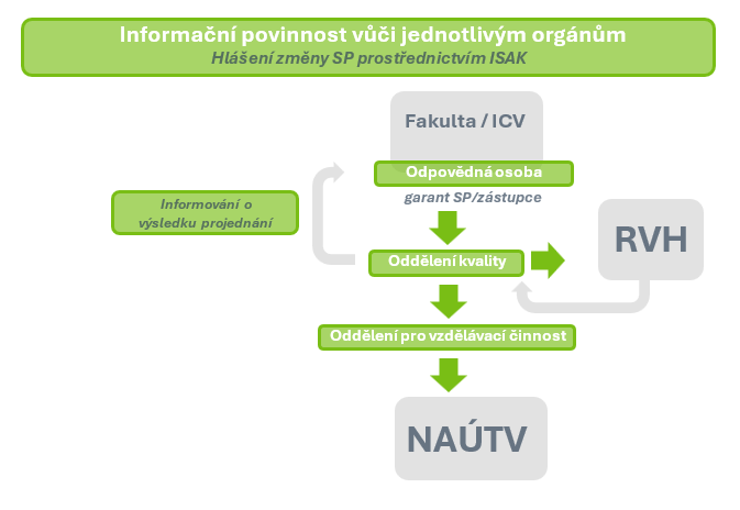 Informační povinnosti vůči NAÚTV se řídí metodickými materiály NAÚ a dále na základě rozhodnutí RVH ze dne 6. května 2025 zahrnuje informování NAÚTV o všech změnách součástí státní zkoušky anebo obsahu těchto součástí.